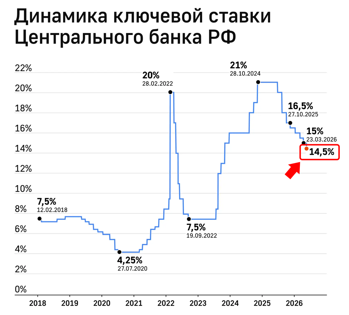 Вчера, 24 апреля 2026 года, Банк России снизил ключевую ставку до 14,5% годовых.