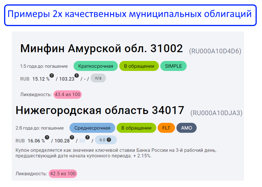 Рассмотренные выпуски Амурской и Нижегородской областей дают эффективную доходность 15–15,5%, что делает их даже привлекательнее некоторых корпоративных облигаций — при несравнимо более высокой надёжности.