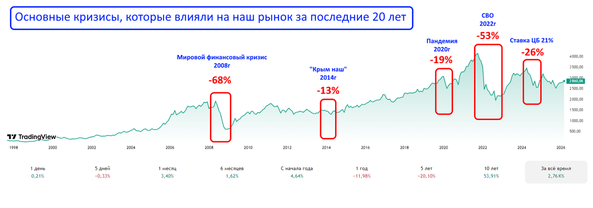 Я изучил историческую динамику нашего рынка и выяснил, что с 2000 по 2025 год индекс Мосбиржи пережил минимум 5 жесточайших кризисов:
