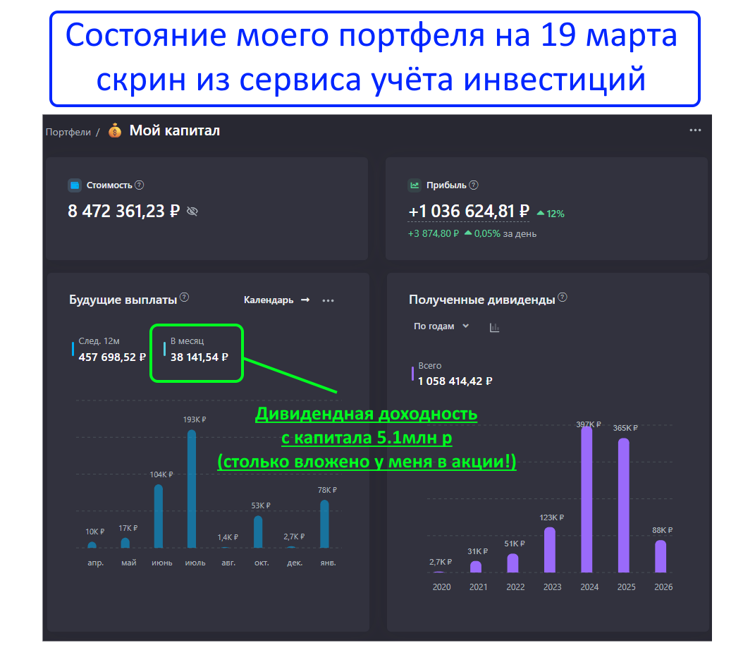 Я планирую, что в 2027г мой портфель выйдет на самоокупаемость: т.е. реинвестируемых дивидендов будет хватать, чтобы поддерживать тот же объем покупок, что и сейчас без моих пополнений. В какой то момент я смогу перестать вносить деньги с зарплаты на брокерский счет, а мой капитал продолжит расти и приносить всё большие пассивный доход! И это всё благодаря тому, что я несколько лет просто терпеливо покупал и держал акции, не дергаясь.