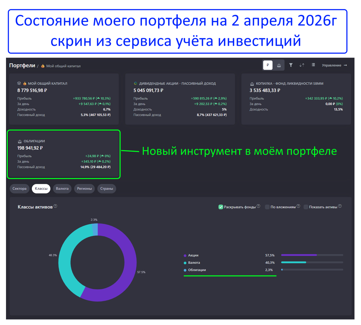 Кстати, сегодня я добавил в портфель облигации, но не ОФЗ, а краткосрочные флоатеры (скрин из сервиса учёта прилагаю):