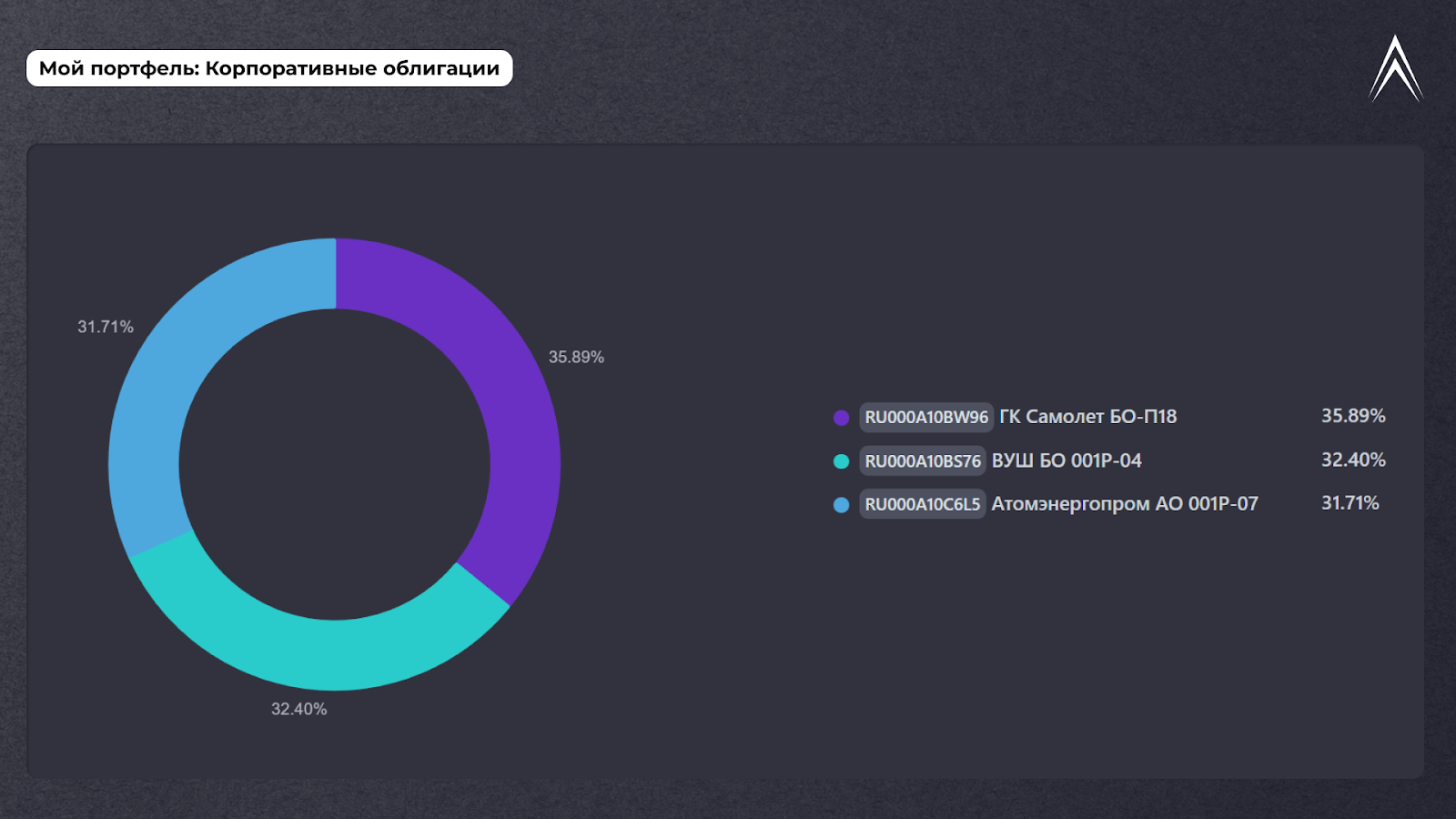 Корпоративные облигации — вторым приоритетом, если бюджет не закончится на ОФЗ, буду брать. Я решил оставить ВУШ в покое и не повышать его количество. Да и Самолет с Атомэнергопромов тоже не буду покупать. Я хочу новый надежный выпуск.