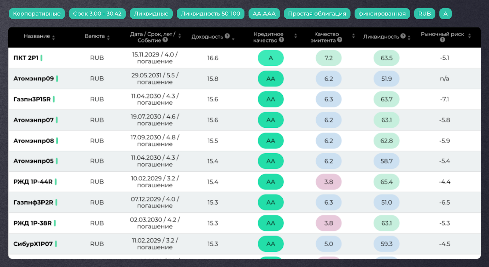 В помощь сайт https://www.dohod.ru/analytic/bonds — тут нафильтровал длинные и надежные ликвидные облигации от 3 лет. Только фиксы. Их мало, и Атом у меня уже есть. Как ни странно, без Атома выбор еще хуже