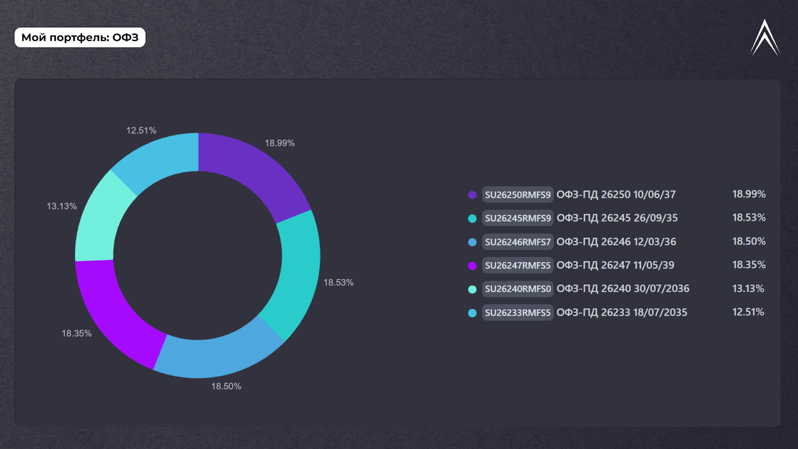 ОФЗ выглядят по-прежнему шикарно. Длинные выпуски продолжают давать отличную доходность, покупать их приятно, апсайд солидный. Буду брать те же 6 выпусков с ежемесячными купонами: 26233, 26240, 26246, 26245, 26247, 26250. Это у меня в первом приоритете.