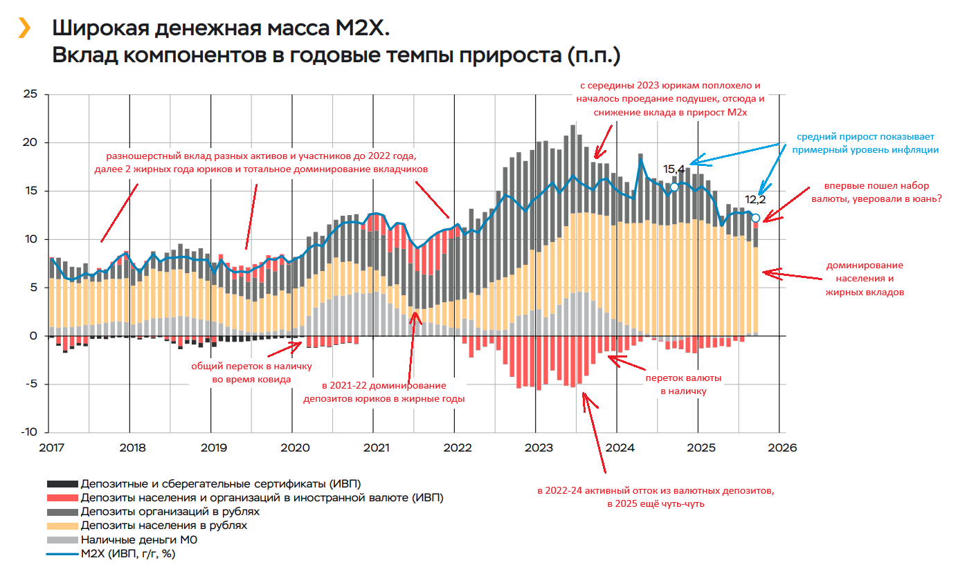 Вывод: пока структура прироста была разношерстная и давала меньше 10% к М2х, у нас и инфляция была невысокая, после 2022 умерли валютные депозиты, после 2024 умерла наличка, в 2025 сдулись юрики.